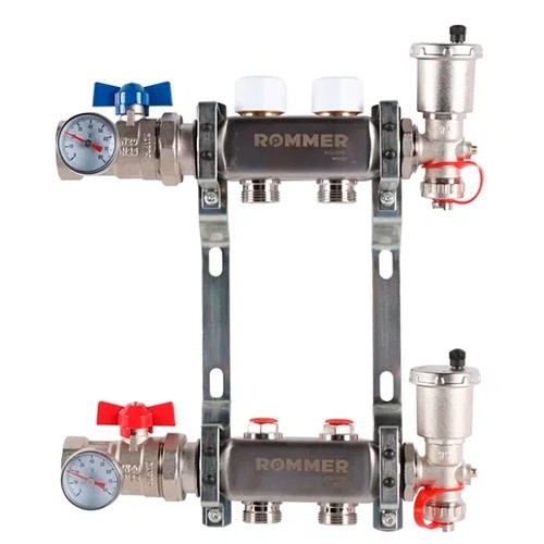 Коллекторы RMS-1210 Rommer укомплектованы шаровыми кранами для отключения от системы отопления, а также спускными кранами автоматическими воздушными клапанами, устанавливаемыми в конце каждого коллектора.