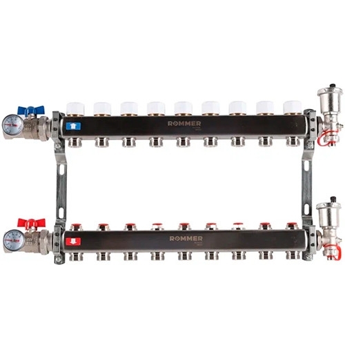 Коллекторы RMS-1210 Rommer укомплектованы шаровыми кранами для отключения от системы отопления, а также спускными кранами автоматическими воздушными клапанами, устанавливаемыми в конце каждого коллектора.